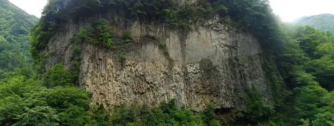 高さ約72メートル、幅約120メートルの柱状節理の「巌立峡」。今からおよ...