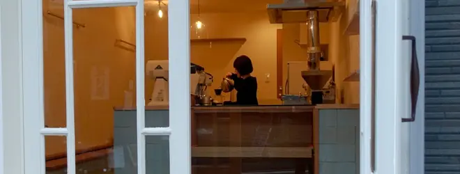 世田谷線宮坂の線路沿い 白壁と木目のおしゃれな和菓子店。窓越しに世田谷線...