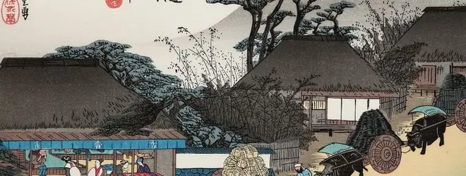 広重は画題を「走井(はしりい)茶屋」とし、「走井餅」を売っていた茶屋を描いている。走井の有名な井戸も描かれている。