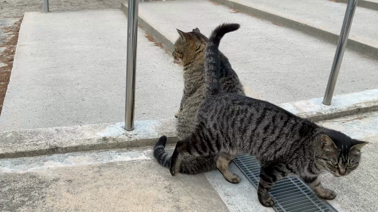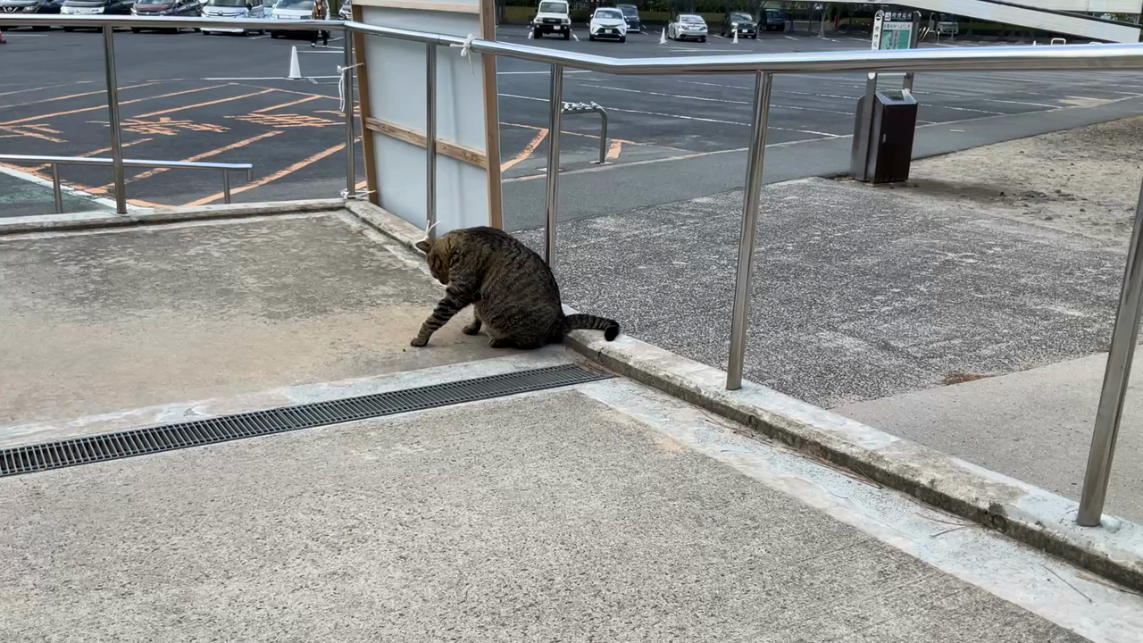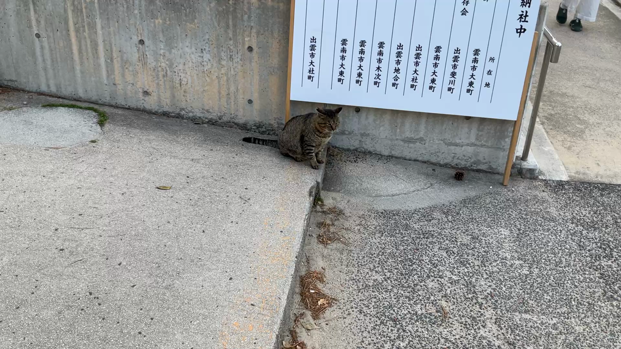 駐車場の脇に猫が2匹いました。猫を見ると、ついつい写真、動画を撮ります。極太のしめ縄。