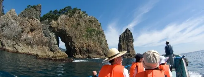 羅賀漁港から1トン前後の小型の磯舟「サッパ船」に乗って北山崎との間を遊覧します。 小型の船なので、かなり狭い岩の間も通ったりスリル満点! 200m上の展望台から見た北山崎を海の上から眺める景色はすばらしいです!