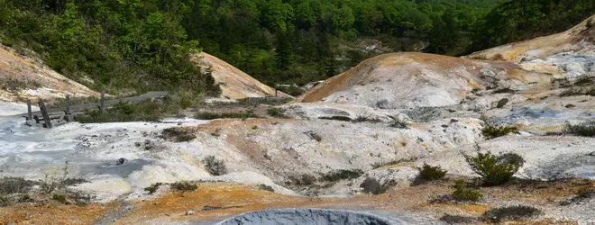 建物のすぐ裏手には遊歩道が整備されており、火山性地帯ならではの迫力ある景色を楽しむことができます。