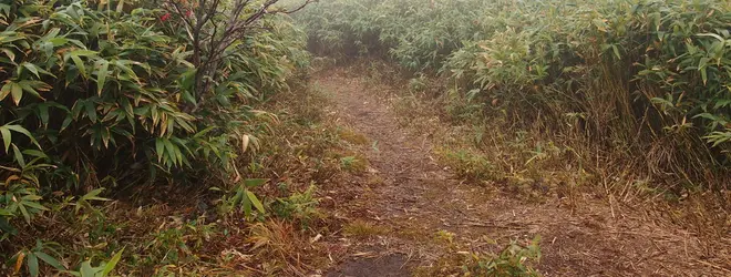 標高1366m。秋田焼山の頂上は、名残峠からちょっと登り、玉川温泉へ下る道の途中を左にそれて100メートルほど進んだ突き当りです。 頂上というから、余程素晴らしい眺望が期待できるのかと思いきや、そこには笹薮に囲まれた三角点が埋め込まれているだけでした。何とも呆気ない頂上ですが、こうした肩透かしもまた面白いもの。しっかり三角点に触って、トップまで登り切ったことを実感してから下山しました。