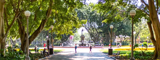 シティにあるオーストラリア最古の公園「ハイド・パーク」。北側にはアーチボルト噴水、南側にはアンザック戦争博物館があります。