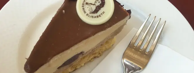 シェーンブルン宮殿の展望台「グロリエッテ」にあるカフェ。シシィトルテはチーズ風味のチョコケーキです。しつこくない甘さ!シシィのチョコも可愛い♡
