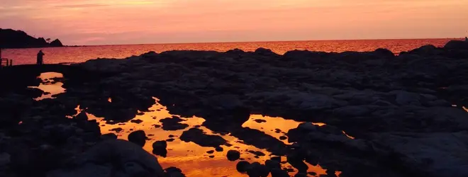 海蝕(かいしょく)作用でできた白っぽい岩が多くみられ、「猫地獄」「像の鼻」「大蛇の背」など、ユニークな名前の付いた岩がたくさんあります。日暮れには、写真のような幻想的な景色を見れることがあります。
