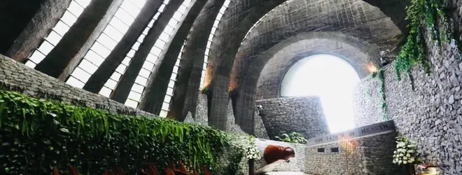 オーガニック建築の代表作。軽井沢の自然に溶け込むように設計され、石とガラスを用いた有機的な造形美があり、光と緑に包まれる神秘的な空間。