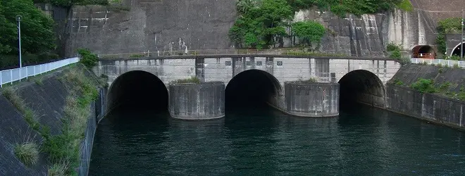 口野周辺の放水路流出口は、山に空いた巨大なトンネルが3つ並んだ特異な形になっており、巨大建造物が好き、という方なら一見の価値はあるかと思います。