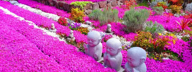 四季折々の花木や芝桜に囲まれた明るい境内には笑顔のお地蔵様もお出迎えしてくれる癒しの寺院です。